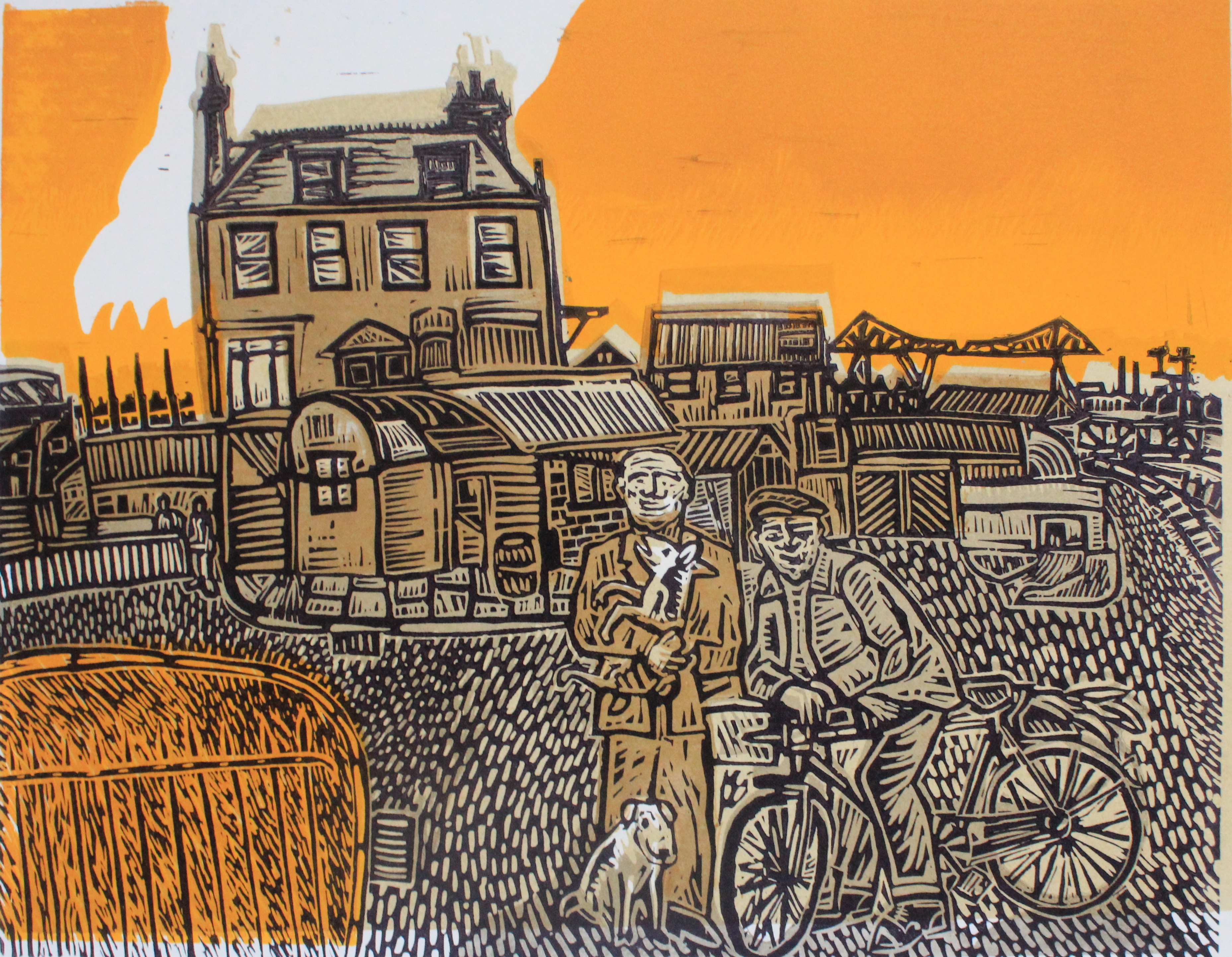 A print inspired by work in some of my art school sketchbooks showing the industrial landscape of the North East of England and Middlesbrough and Teesside in particular. Two workmen, or ‘gadgies’ as we used to call them as children, near the ‘Black Path’ in Middlesbrough having been out with their terriers on a ratting expedition around the docks. I’m convinced that seeing these little terriers as a child, we had a black and white Jack Russell who was my best friend when I was a toddler, and then as an art student inspired my love for Jack Russells in particular and all the other numerous terrier breeds too. The Borders, Patterdales, Lakeland, Bedlington, Staffordshire, Fox Terriers and many, many others, inevitably most of them could start a fight with their own shadow so god help any rats that were unwise or careless enough to cross their path.