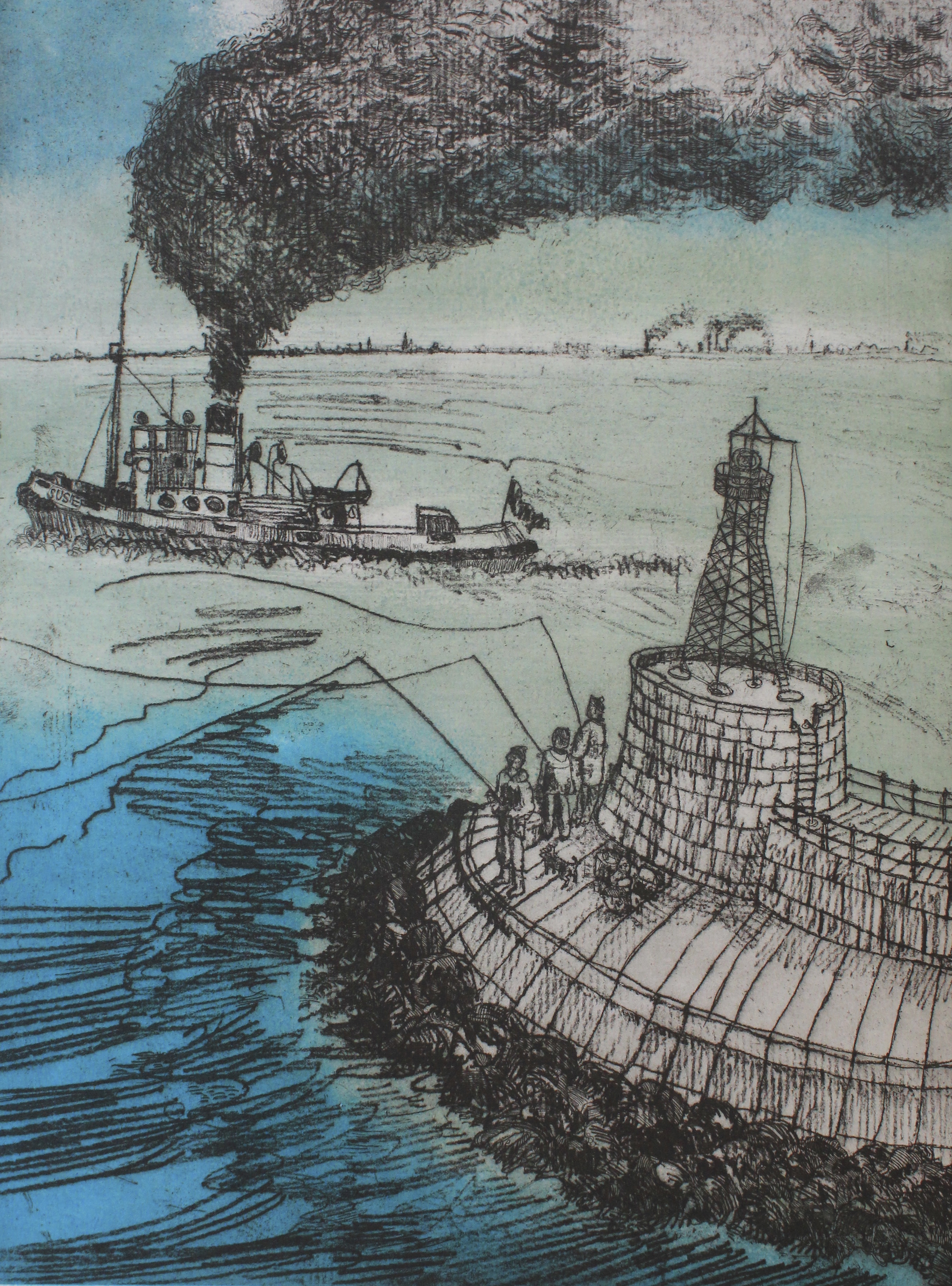 Tugboat, fishermen and terrier. Etching in three colours on 300gsm Somerset Velvet White in an edition of ten. Image size 400mm x 300mm. £120.00