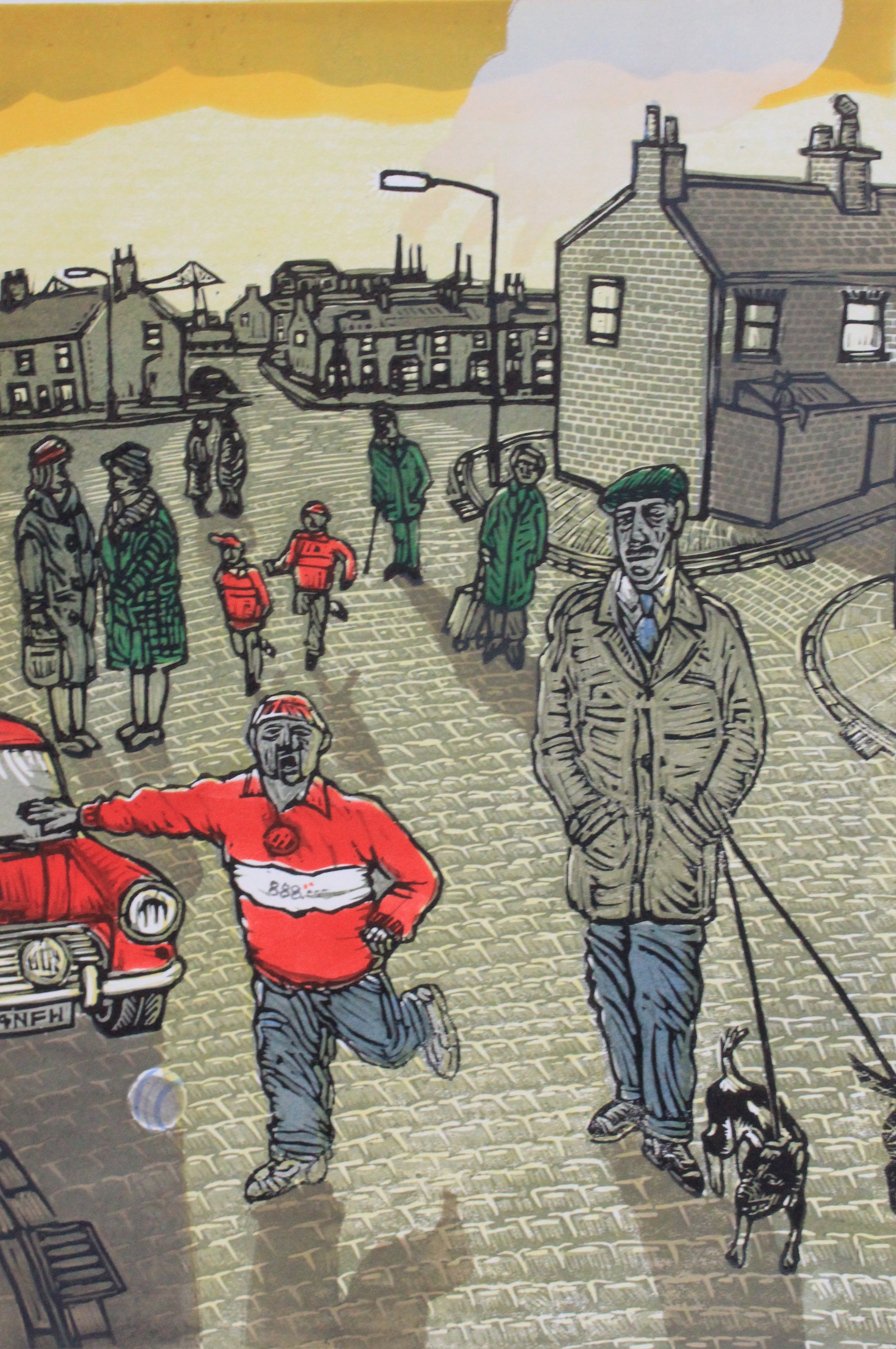 An early football print from the series based on Television commentator’s cliches, in this case ‘Jimmy pulls the trigger’. This print is about is about kids playing football in the street. Do they still do that? More often than not the cry from householders was go and play on a field but in most cases they were private and had watchman or ‘gadgie’ to chase them off. Anyway there’s nothing quite as satisfying as the thwack of a football on a brick wall or fence, the enraged house- owner was just a bonus or a diversion and the players were too quick for him to catch them. They just moved on to another make-believe arena before returning later. I remember once coming home for the vacation from art-school and seeing some kids who lived opposite playing football using their gateway as the goal. I shouted at them to pass the ball to me as I walked down the grass verge and one of them did, it was a lovely floated pass too. I volleyed it, the goalkeeper decided it was coming too quickly for him and dived out of the way, the heavy football went straight through the picture window with an almighty crash and the sound of falling glass. The players disappeared and silence afterwards was deafening but only for a short while. That volley cost me.