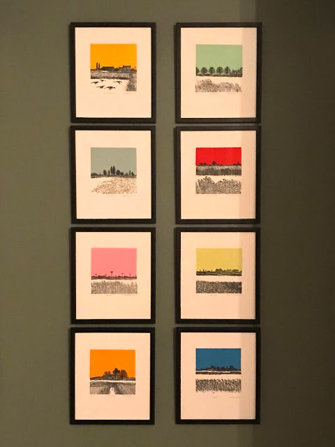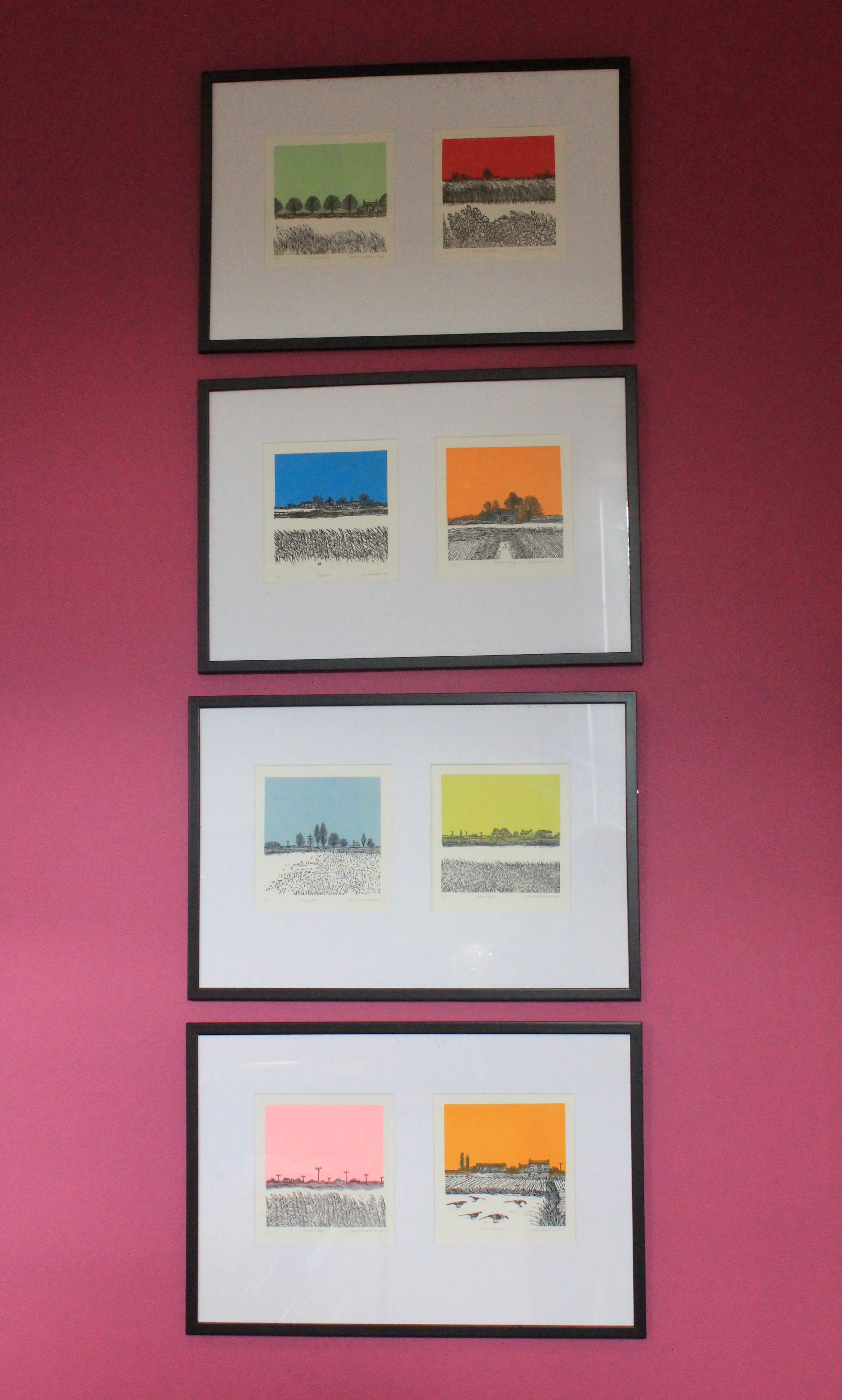 Here are all of the eight prints of the ‘skies series’ of linocuts.One set has been framed as singles and the other set mounted in pairs and hanging on walls that have been painted in very different colours.