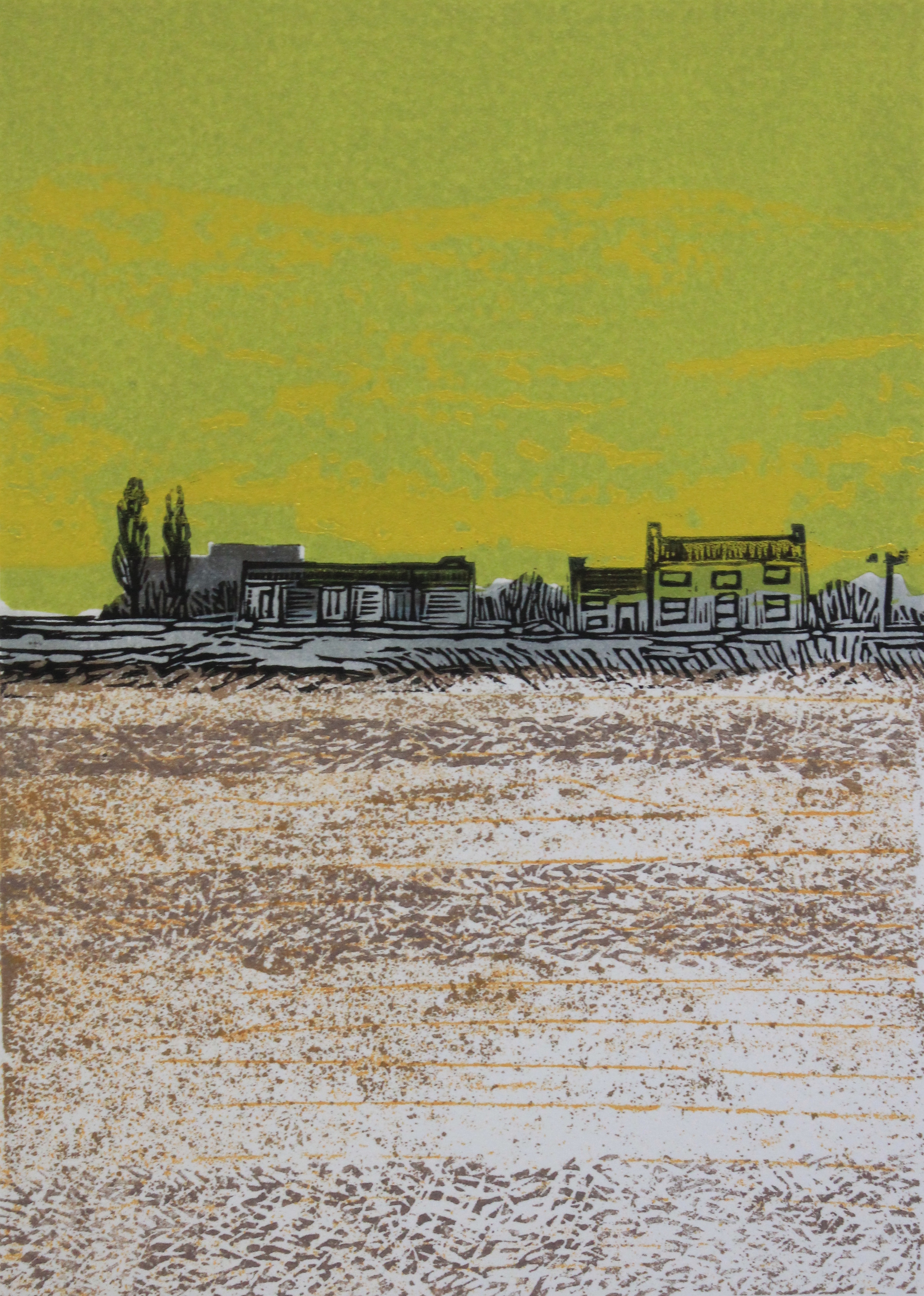 Wheelings. Linocut printed in six colours on 300gsm Madrid Litho White in an edition of ten. Image size 210mm x 150mm. £75.00