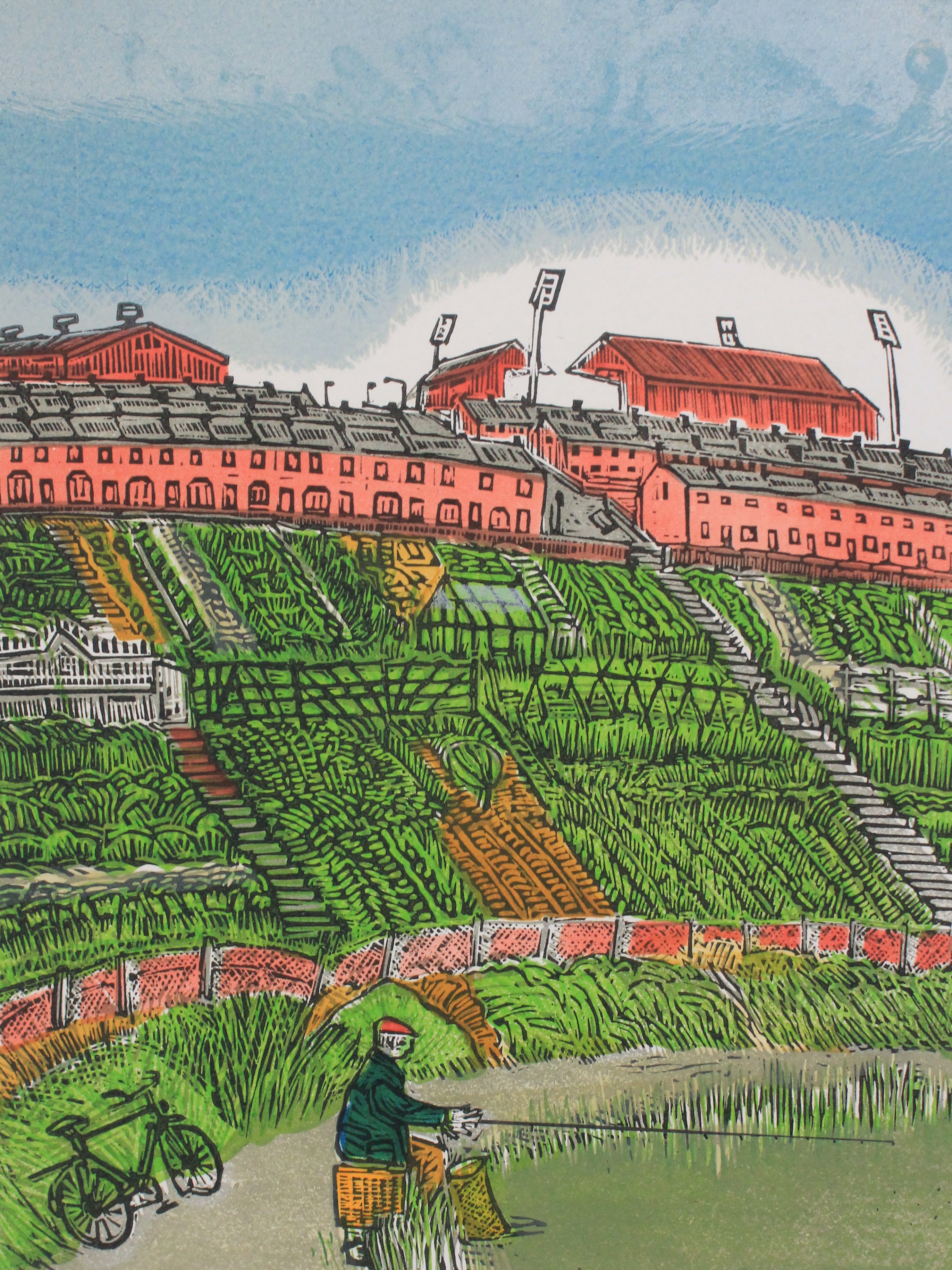 A linocut depicting a compilation of sports and pastimes. A lone angler fishing in the canal, allotments, deserted streets, a factory and a packed football stadium. It must be Saturday afternoon. The print is a compilation of landscapes too, stirred around in the imagination and out pops an image that is a bit Midlands, a bit North East England and in reality it could be almost anywhere in England.