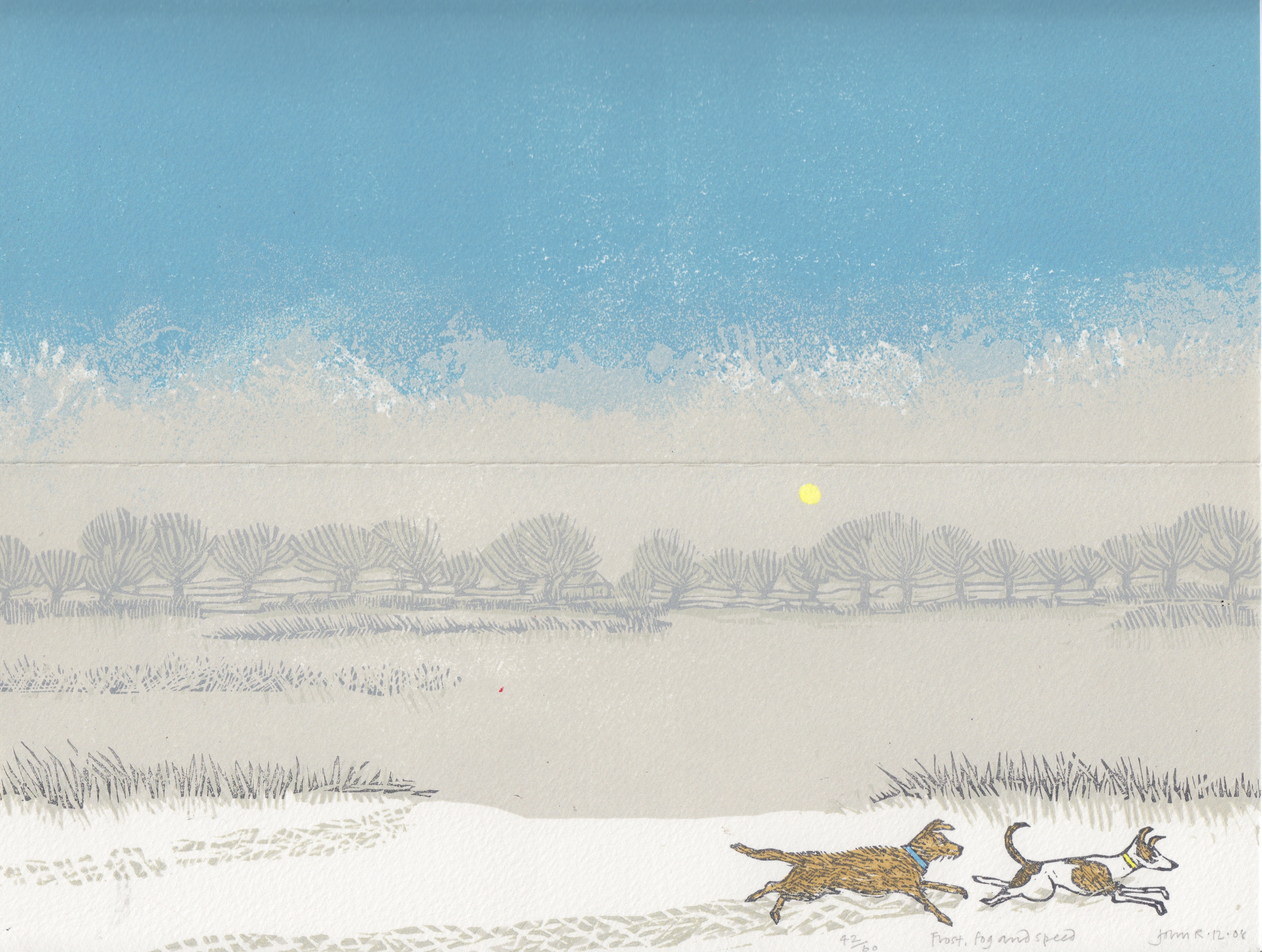 Another, later Christmas card this time from 2008. Our two Jack Russell Terriers Minnow and Rufus chasing one another through the frost and snow by a Berkshire Pond on a freezing and bitterly cold winter’s day with the sun just visible through the freezing fog. Minnow is at the front being pursued by Rufus. Something about extremes of weather seems to send the terriers that we’ve owned into a state of hyperactivity. Rufus, aka Ruffe, was in fact a Jack Russell/Border Terrier cross and he was seventeen and a half when he died in 2012 and Minnow was almost twelve when she died in 2018. Happy days and sad days, part of the pleasure and pain of owning dogs. The horizontal line is the crease for folding the card and there’s a red pike float just visible off the first bed of reeds and rushes.
