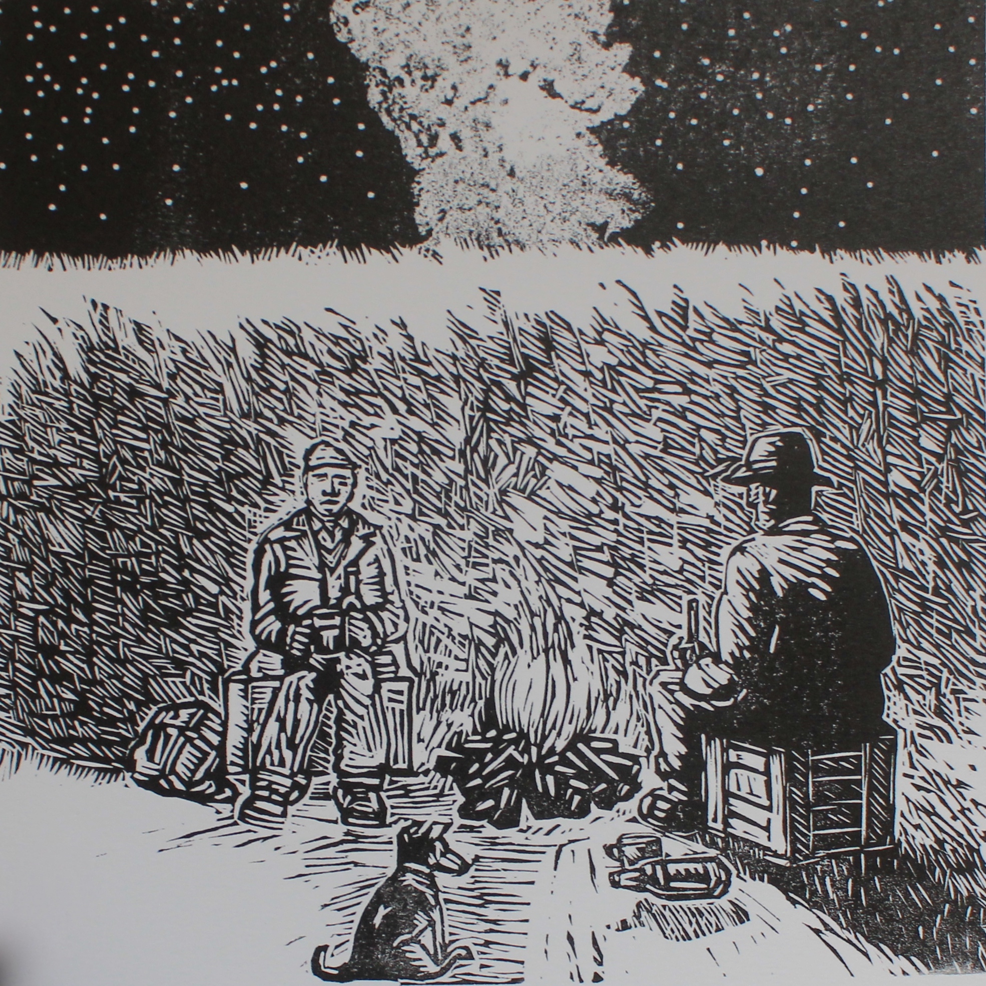 I cut and produced this print for a friend’s son who is at university studying the music industry and music production and everything else that the subject entails. The linocut is going to be used on a CD cover after digital manipulation and goodness knows what else, it’s a mystery to me so far, but I am looking forward to seeing the finished graphics. Anyway the brief was to show a couple of old fen labourers sheltered by the reeds and sitting by a fire having a natter after a long hard day at work on the land. They’re enjoying some cider and inevitably I’ve added a Jack Russell Terrier who is either supervising or disapproving of the whole proceedings. The print is really an illustration and not an editioned print.