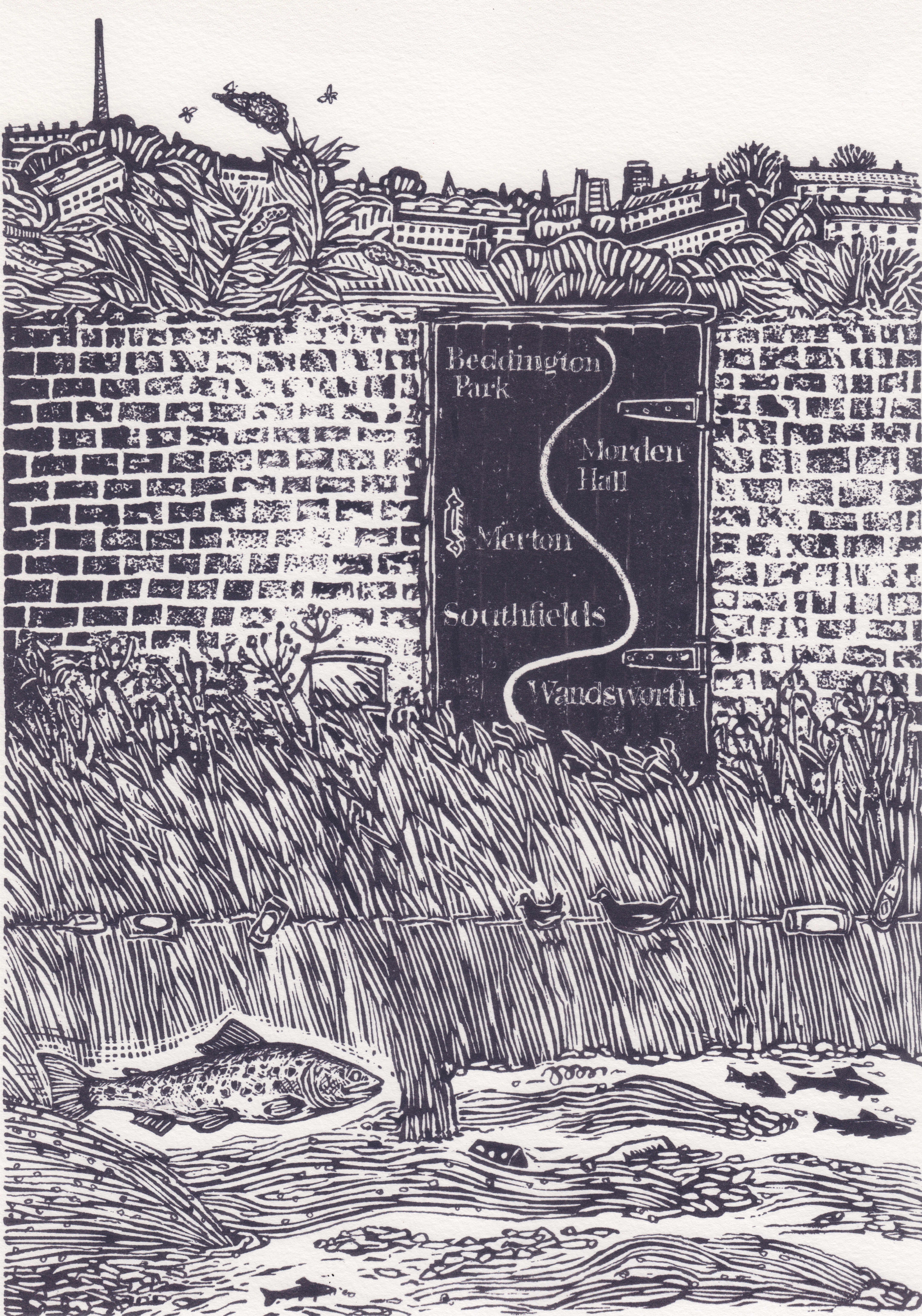 A trip back to the maps commissioned by Caught by the River and in this case one of my favourite linocuts of the series. The subject is the River Wandle in South West London, a short river that flows into the tidal River Thames at Wandsworth, near its source the river is rural but for much of its course it flows past allotments, through parks, shopping centres and gardens. I was intrigued by the thought of having a river as productive as this just beyond my garden gate, brown trout, barbel, roach, dace, perch chub and gudgeon available to you just yards from your shed and back door. I have a sneaking feeling that not much gardening would get done. The result of all these musings was that the back garden gate had a graffiti map of the river, it would be your personal reference point every time you looked over your shoulder as a fresh cup of tea arrived. Or a beer. Well you can but dream.