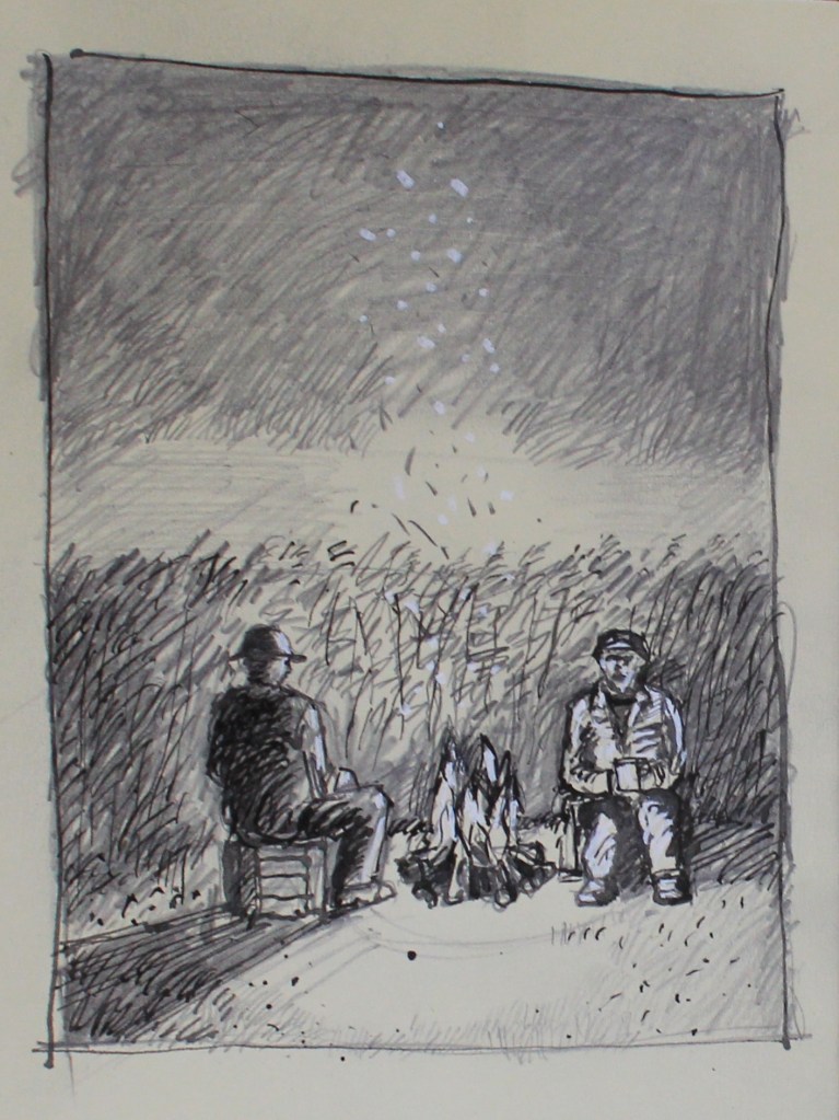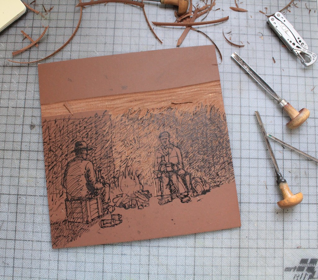 This print is a bit of a funny one, in fact it’s the story of a print from the initial rough sketch that was produced for approval through to the final proof. The print was a special request by a good friend’s son who left the interpretation to me and his intention is to use the image on an album cover, as an aside I’m told I shouldn’t describe it as a record or CD cover anymore. The final print is being digitally manipulated and I’m looking forward to seeing the finished piece when he returns from the USA where he is at University studying Music Engineering. Anyway, here are the three basic stages in reverse order starting with a finished proof, then the Lino block drawn up and being cut and finally the original scribbled idea. The brief for the prints was based on two Fenland agricultural workers enjoying a social occasion on their way home after work whilst warming themselves around a fire and enjoying a little therapeutic use of the local brew, probably home-made cider, in the shelter of a giant reed bed. Their little terrier looks unimpressed, just as the respective wives will be when the reprobates finally return home, probably the worse for wear. No doubt the little Jack Russell will be at fault when the blame marches down but he, or she, can look after themselves. Mind your ankles boys.