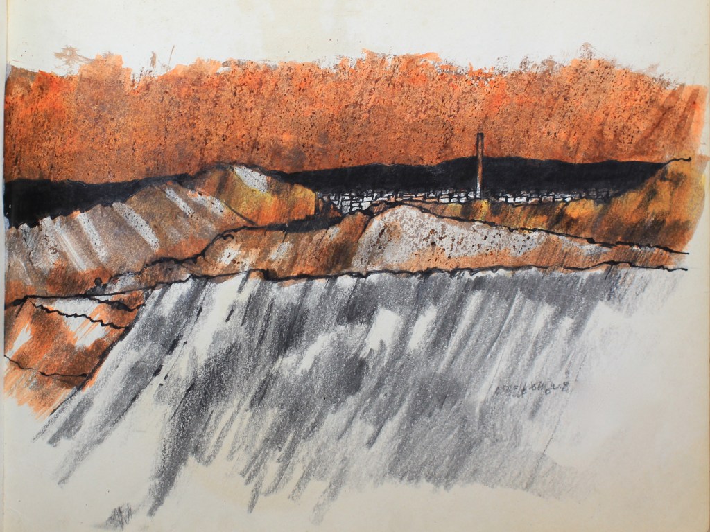 I know that I constantly bang on about sketch books but here’s an example of returning to drawing that was made, in this instance, in 1965. That fact alone is really is quite frightening. Anyway this subject, slag heaps, did have a run out as lithograph in the same year and I have a copy somewhere. Inevitably that copy is filed in the proverbial ‘safe place’ and as we all know that ‘place’ is like the ‘Bermuda Triangle’. No doubt the print will turn up in a couple of weeks exactly where I didn’t think it was and if it does I’ll add it to this post to complete the story. A couple of years ago I decided to rework the subject as part of a new series of prints on the old heavy industries of the North East, in this case mining, and it came out as a print entitled ‘Another day in paradise’. It was posted on 28 January 2019. One of the great things about sketch books as is that you see and reference a subject as one thing but when you look at it many years later you see it in a completely different way. Through different eyes you could say. So here’s the original drawing in the sketch book from all those years ago followed, underneath, by the later print with the landscape viewed through different and older eyes.