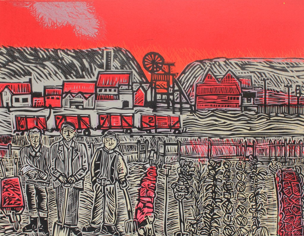 Allotments and pit. A linocut in four colours printed on 250gsm Arches 88 in an edition of ten. Image size approximately 200mm x 300mm. £120.00