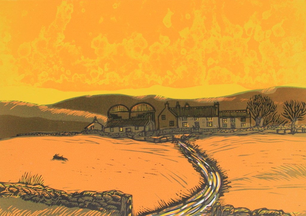 Another landscape print from my home area but not really a Teesside industrial scene this time, although farming is an industry. For this print the subject matter is based on a family farm that was situated in Bilsdale in the North Yorkshire Moors near the village of Chop Gate. I used to spend all my spare time and every school holiday there working on the farm, shooting and trout fishing. In truth this is a print from memory and probably combines a bit of dewey-eyed nostalgia and the elements of another family farm in Raisdale, the next dale to the west and over the top of the appropriately named Cold Moor, even in summer it could be cold let alone winter, autumn or spring.