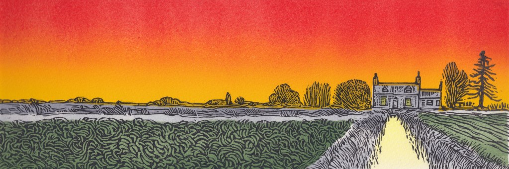 Sunset House. A linocut in six colours on 300gsm Fabriano Artistico Brilliant White HP. Image area approximately 100mm x 300mm. £65.00