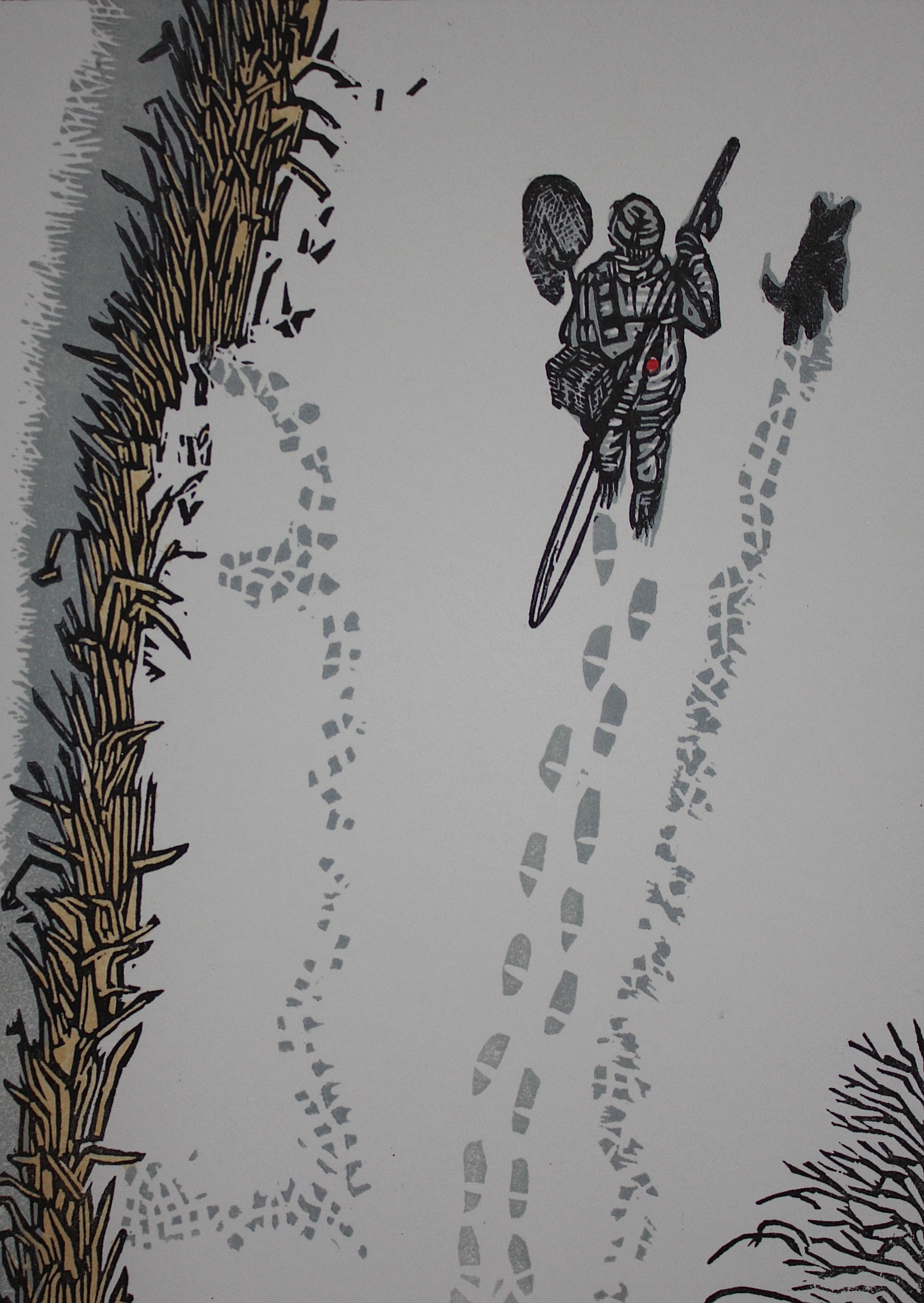 Christmas cards. Every year I say that last year’s production was the last print run and I will produce no more but this year it’s a compromise so the run is going to be shorter, much shorter. The first card that I produced back in the mid-nineties had a run of twenty cards then, gradually, the number produced gradually rose to a run of over sixty cards. A lot of work, in fact a serious amount of work. Needless to say the cards featured the terriers that we had then and the main subject was always pike fishing. Our first Jack Russell terrier was called Pike so that established the link but over the years the subject became water, and terriers and that developed into landscape and now the Fenland landscape. And guess what? Time has marched around to that time of year again when I need to start thinking about what to do for this year’s Christmas card, apart from printing a reduced number to increase the rarity value. That’s a bit of a delusion statement. Here are two old cards ‘Walking with the fishes’ and ‘Nice and warm in here Minnow’. The first shows the trudge back to the car through the snow, something we never see now, after an afternoon’s pike fishing and on the other card our two Jack Russell Terriers enjoying the warmth of the wood burner in the boat on an icy evening. Sensible dogs.