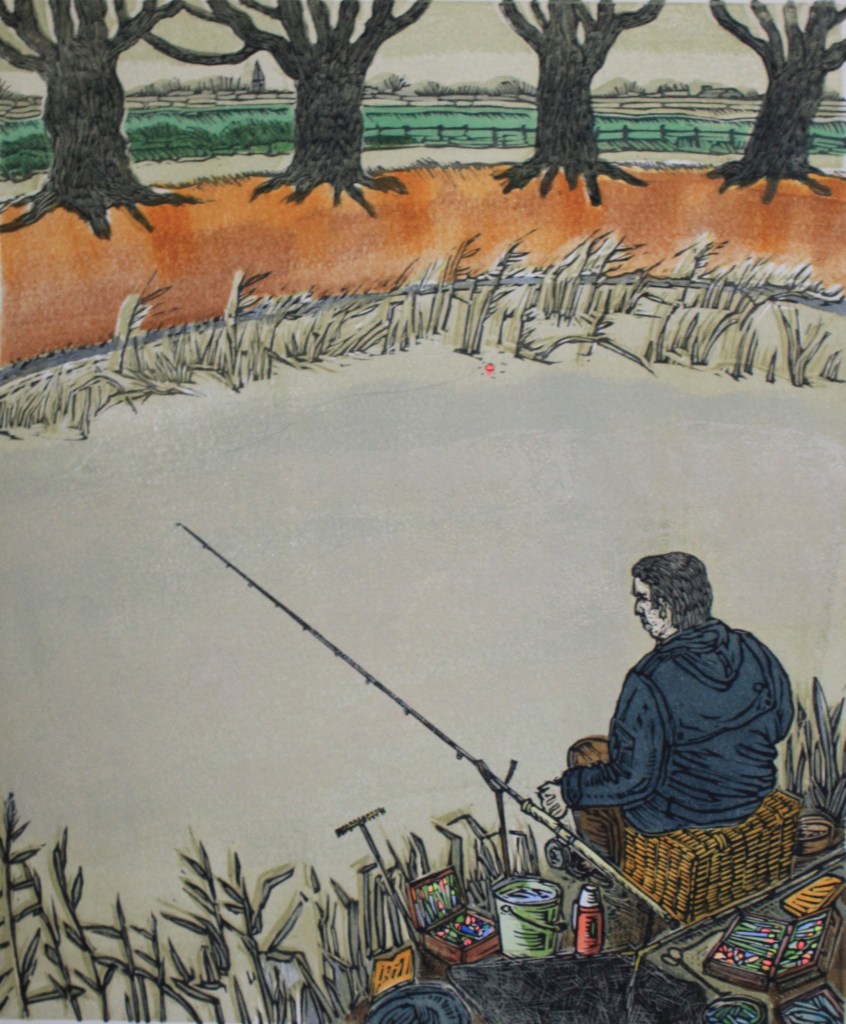 This print, ‘Pike at the mill’, was drawn, cut and printed very early on in my linocutting career and before I bought my New Improved Albion Press. The commission was very specific about what had to appear in it , so much so that I tend to think of it as a commercial illustration rather than a print in the purest sense. I was also at the very beginning of a personal printmaking road that I’ll never ever get to the end of and the brief did in a way hinder expression but as I always say you always learn something from every print you create whether you like it or not, or whether it was a success or not. Perversely, and despite what I think, this is the only print remaining from an edition of twelve so a few people must have liked it, even if I can’t understand why.