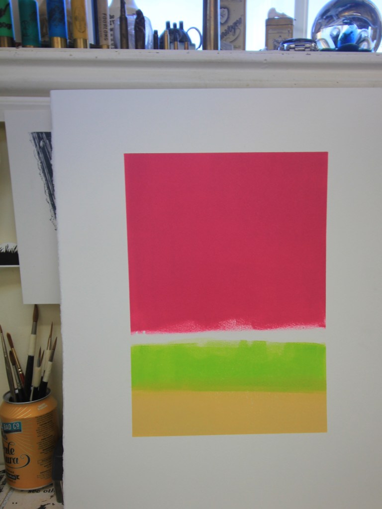 The work-in-progress has now become a finished print and the first of a series of three or maybe four prints using the same subject matter and blocks. I’m not totally happy with this, the first version but the Boss, my sternest critic, loves it and she’s told me off for being a pain in the arse. Fair enough I say, you can’t argue with the truth. Below are the progressive printed images that followed last weeks post and the images in the group show the next four stages in the printing process. At top left the addition of the ochre yellow printing followed by the green of the winter wheat. This is followed at the bottom left by the printing of the key detailed block and the addition of the pale yellow on the horizon. Then at bottom right the double printing, two colours printed at the same time, of the small areas of green in the copse and orange of the far reeds. Now it’s onwards to two more versions of this block to complete the set of three, I have a rough idea in my mind of what they’ll be but things have a habit of changing as they develop, as in I change my mind or have what I think is a better idea.