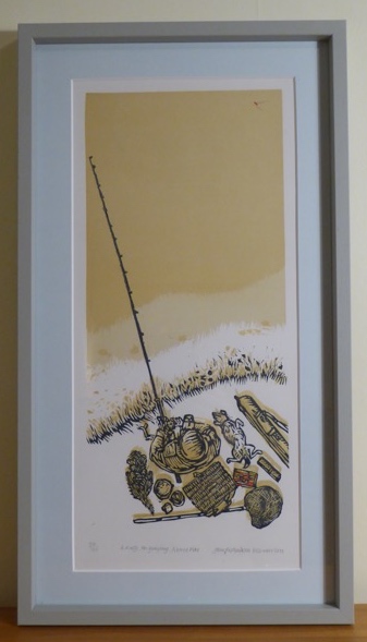 A couple of pieces of work sent to me by satisfied customers. first of all ‘The Float Box’ a print sent all the way to Georgia to a lady called Lisa who purchased the print as a Christmas present for her husband Chris. They were both delighted with the present and they obviously couldn’t wait for a Christmas Day surprise opening after fighting the frame out of the stocking. Then a series of prints incorporating a Christmas card from a lot of years ago that was overtaken by a disaster. The original card that featured our two terriers Ruffe and Pike, sadly now both deceased, was lost or damaged in some accident so I sent a spare and now ‘A Ruffe, no Grayling and a bored Pike’ are preserved for a lifetime in a new frame. Even my Compliments Slip with the linocut of Pike, our very first Jack Russell Terrier, has been framed. Another Fenland Christmas Card, ‘Piking on Pophams’ is a part of the display too.