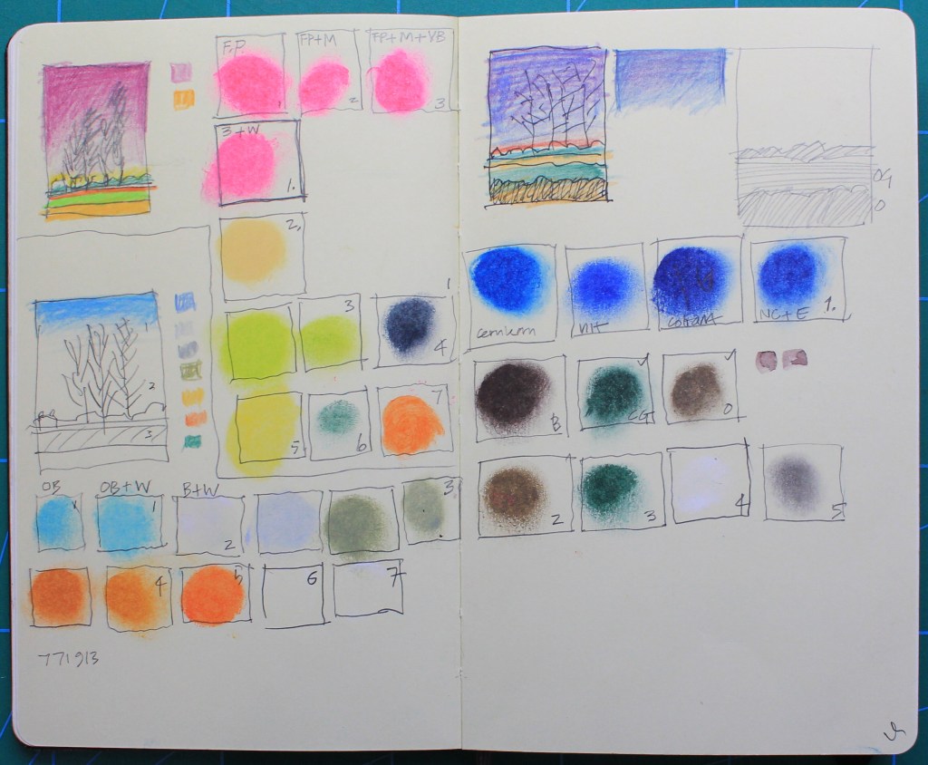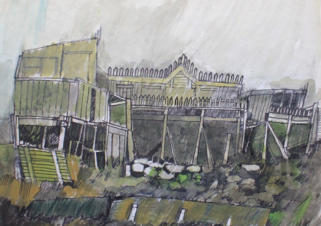 A slight pause for breath here as yet another subject theme is started, that’ll be just in case I have nothing to do. I’ve started a new and ongoing print in the ‘Skyline’ series but because of a comment by a follower of the blog I’m returning to some old sketch book work from the time when I was at art school in the mid-1960’s. The comment that struck a chord was a suggestion that there’s ‘nothing wrong with going back to school’ so I’ve taken the suggestion as a challenge and decided to revisit subject a subject and bring it up to date. The subjects in question are the ramshackle pigeon lofts, those strange and seemingly random constructions that were always built in the back gardens and on the allotments of the pigeon fanciers and enthusiasts. The other thing that I noticed as I hunted around for old subject references is how the sketch and drawing books have, over the years, become planning and notebooks with the reference to how colours are mixed, colour mixing and record keeping rather than just drawing books. Maybe it’s getting older and something to do with forgetfulness, I’ll stick with thinking I’m totally thorough and developmental in my record keeping. Meanwhile at the top left is one of the old drawings of pigeon lofts and bottom right is drawing from somewhere on or near the Black Path near one of the Middlesbrough steelworks.