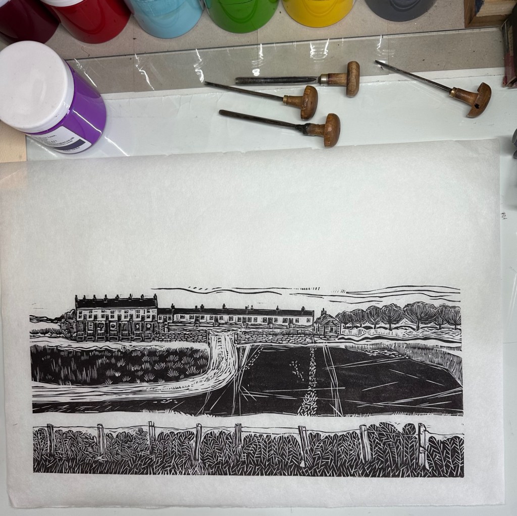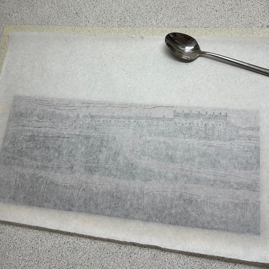 I’ve been working on a woodcut to get my hand back into cutting them although I don’t have anymore suitable wood left when then this print is finished so that’s another project, finding more suitable wood! never mind it keeps you busy. Anyway this print will be in two colours when it’s finished and this is the first proof then when I’m happy with the block I’ll produce a run of five on this Japanese paper which is very lightweight, almost like tissue, and difficult to handle in large sheets. The block is too big for my press so it’s a table top burnishing exercise; the first image is the paper laid on the inked block, the second is the paper still in place but now burnished with a spoon and the third is the proof peeled off. I had a Japanese Baren to burnish the print with but I can’t find it. I suspect that a certain Jack Russell Terrier found it interesting and tested it’s teeth and jaws on it somewhere in the back garden so I used the old standby, a desert spoon. The finished print will be revealed next week.