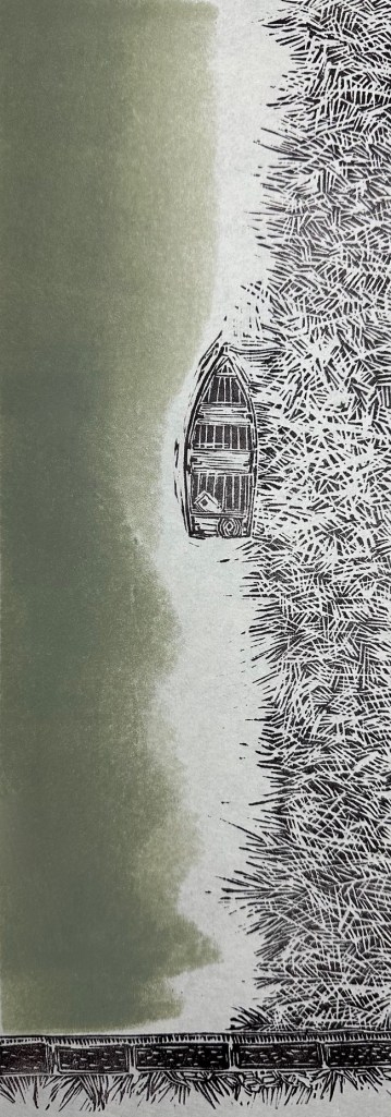 Another attempt at Japanese hand printing with a Baren, this time a view from a bridge that has been printed in two colours and the finished image size is 12.5inches x 4inches. How the owner of the old wooden boat tied it up securely in the dense reed bed I don’t know and how did het get out with all his fishing gear? Questions that will never be answered because I don’t think it will survive this winter, it’s already filling up with water and it won’t be very long before it slips beneath the surface. Meanwhile I’m continuing to experiment with the method of printing and I’m determined to master it while keeping the use of colour to a minimum. I’m just using two colours and no more colour is needed, but it’s a mind wrestle not to add just one more! However the next print is planned as a three colour printing but I may not get that finished before Christmas. We’ll see. A Merry Christmas and a happy and healthy 2025 to everyone.