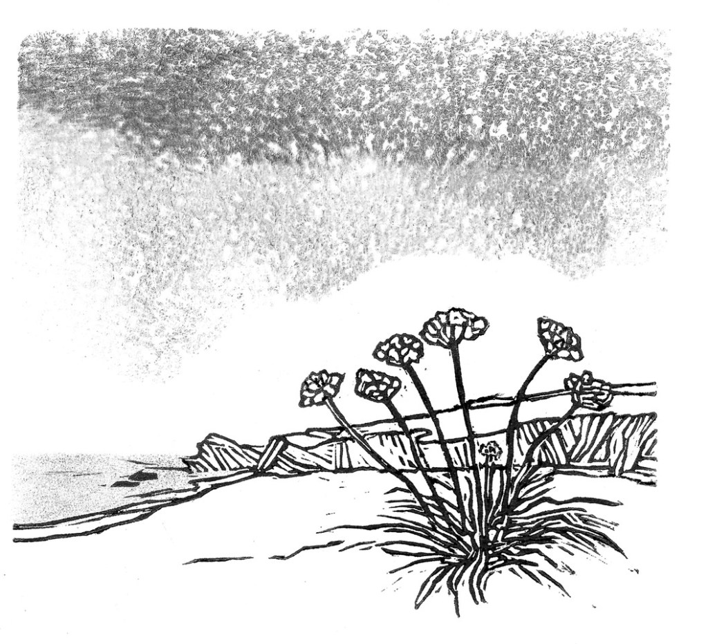 The third and fourth chapter headings and a simple image showing that absolutely hard as nails plant Thrift or Sea Pink. A cushion of green some long stems and little tufts of pink flowers, how it ever survives the vagaries of the weather seaside weather while hanging precariously to cliffs and cracks in the rock I don’t know but somehow it does. The second heading shows some amusements on a pier all lit up at night and no doubt very colourful. The chapter is a memory of two young lads fishing at night with the lights in the background and the sound of pop music drifting over carried on the wind not to forget the appetising smell of fish and chips too!