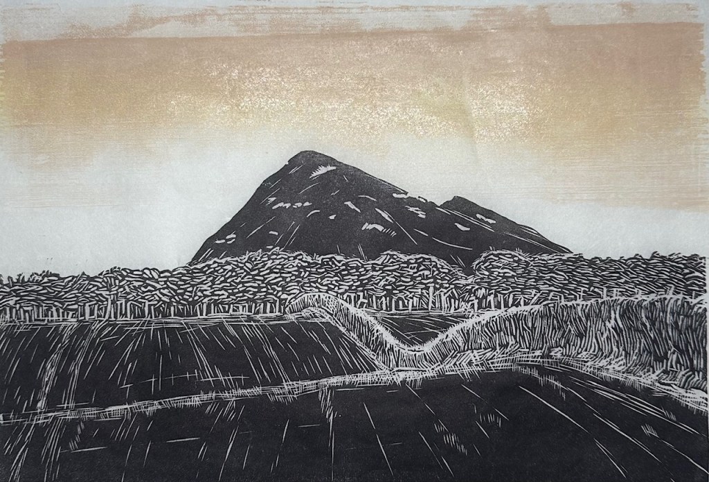 The final proof of the woodcut of the old Kilton Mine Shale Heap. I’ve printed in dark grey and two yellows for the industrial sky on Japanese Tissue, not the easiest block to cut, in fact hard work, but when finished it’s sufficiently melancholy for the subject matter. I can remember returning to Teesside on the train from Art School in Newcastle and being fascinated by the yellow skies which were probably caused by pollution from the steelworks, coke ovens and chemical works, there was a real other world and alien feel to it. Science Fiction skies if you like and once you started looking for them you could see them through the County Durham Coalfield on the way north up to Wearside and Tyneside but the reveal as you went south towards Teesside was something else, proper yellow skies.